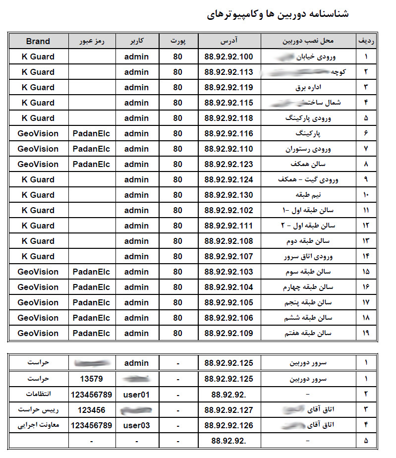 یک فایل است که معمولا با برنامه Word یا Excel تهیه می شود. به عنوان مثال در یک پروژه دوربین مدار بسته که به صورت تحت شبکه کار شده باشد، در این فایل نام دوربین ها، آدرس آی پی به همراه پورت ، محل قرارگیری و نام کاربری و رمز عبور جهت تنظیمات داخلی دوربین ها و همچنین تعدادکاربرانی که در شبکه تعریف شده به همراه نام کاربری + رمز عبور و سطح دسترسی آنها، نوشته خواهد شد.